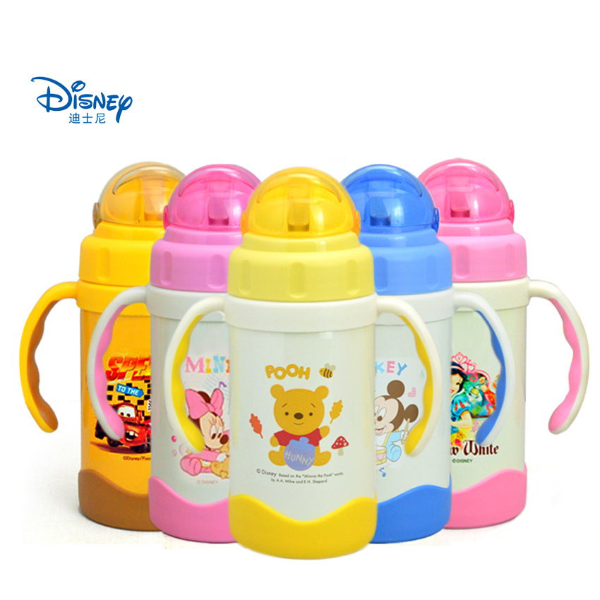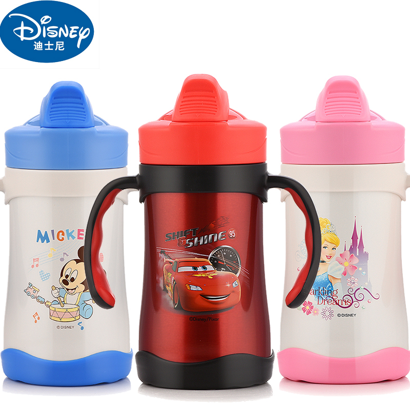 迪士尼保温吸管杯宝宝不锈钢学饮训练杯儿童带柄保温直饮水杯3220
