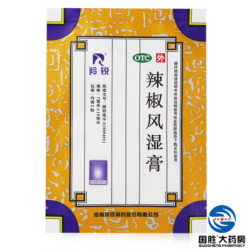 有效期:24个月 用法:皮肤外用 药品分类:非处方药 套餐类型:标准装 适用人群:成人 品牌:LINGRUI/羚锐 产品剂型:贴剂 类别:中药 生产企业:河南羚锐制药股份有限公司 使用剂量:贴于患处 批准文号:国药准字Z19994011 疾病:关节炎.冻疮.风湿骨痛 药品名称:辣椒风湿膏 药品通用名:辣椒风湿膏 症状:扭拉伤.瘀肿.瘀血肿痛.腰腿酸痛.风寒湿痹 规格:2贴/袋 查看全文