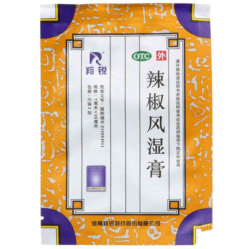 适用人群:不限 有效期:24个月 用法:皮肤外用 药品分类:非处方药 套餐类型:标准装 品牌:LINGRUI/羚锐 产品剂型:贴剂 类别:中药 生产企业:河南羚锐制药股份有限公司 使用剂量:贴于患处 批准文号:国药准字Z19994011 疾病:关节炎.冻疮.风湿骨痛 症状:关节红肿.扭拉伤.摔伤.瘀肿.腰痛.腰腿酸痛.风寒湿痹.骨折 药品名称:辣椒风湿膏 药品通用名:辣椒风湿膏 规格:2贴*10袋/盒 查看全文