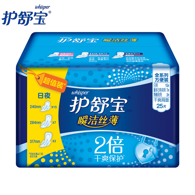 护舒宝 瞬洁丝薄全系列方便装25片 日用夜用组合干爽透气吸收力强