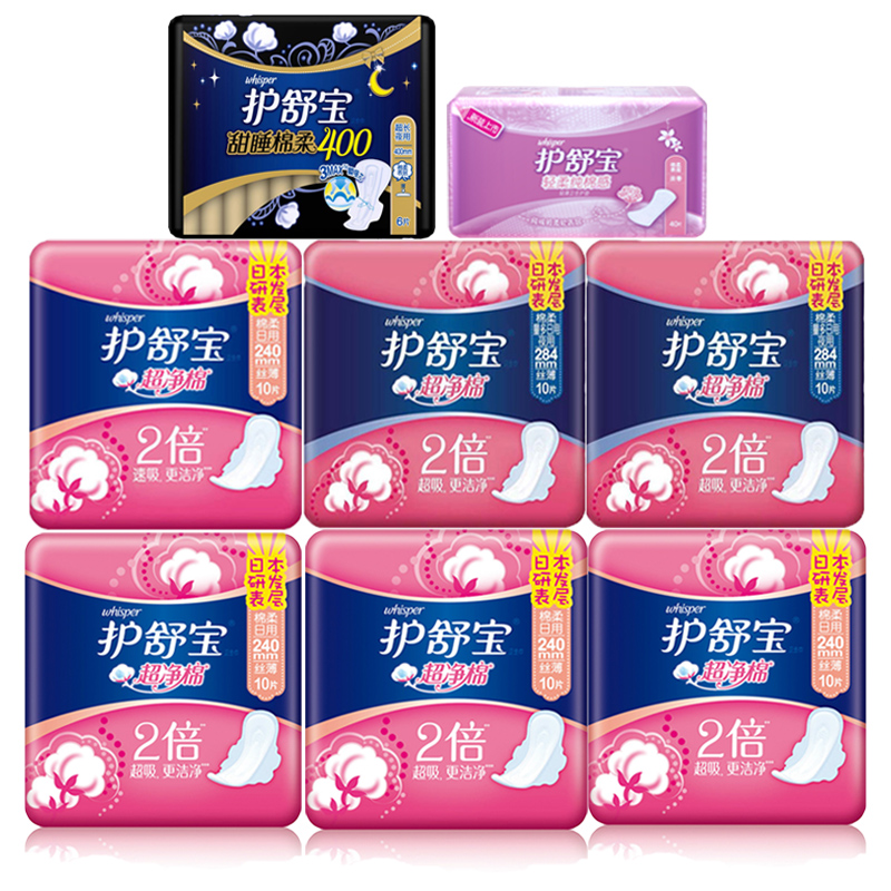 护舒宝卫生巾超净棉日用4包+日夜用2包+夜用6片送无香护垫40片