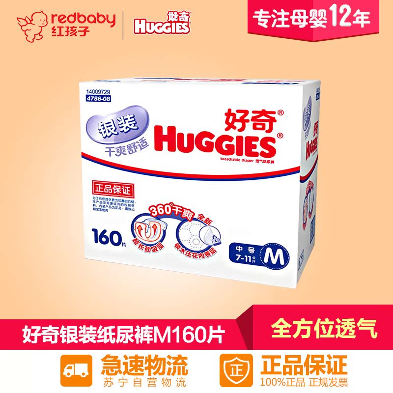 【红孩子母婴】好奇银装干爽舒适纸尿裤箱装M160片(7-11kg)