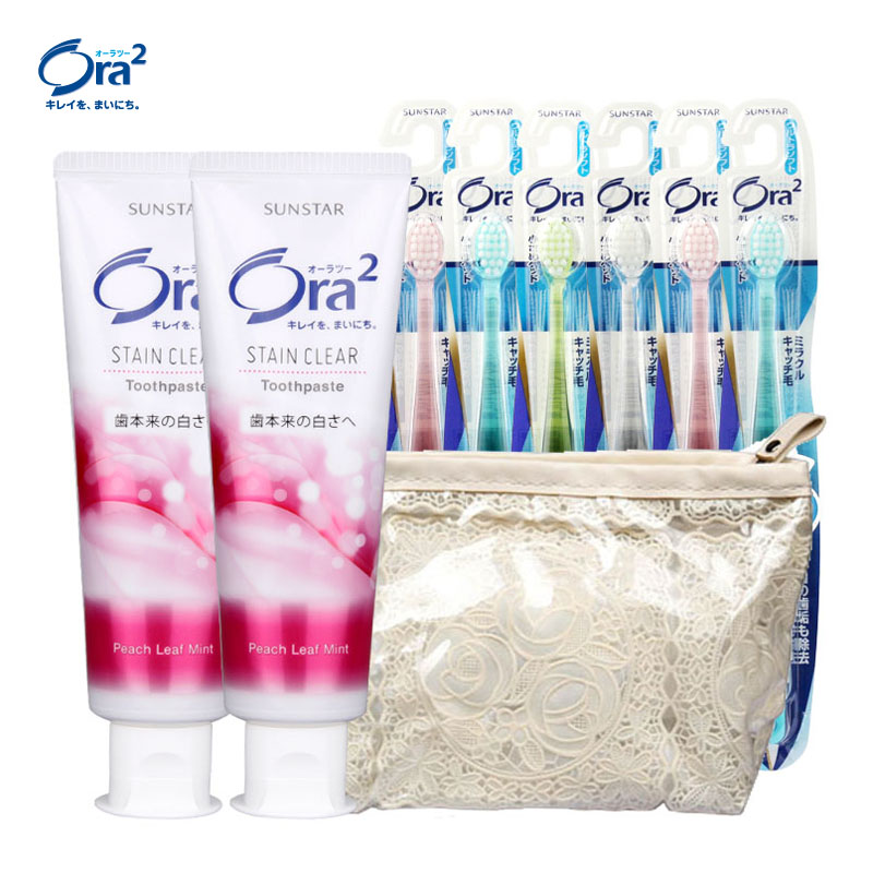 日本皓乐齿Ora2 鲜桃牙膏2支超软牙刷6支组合套装亮白去渍超值