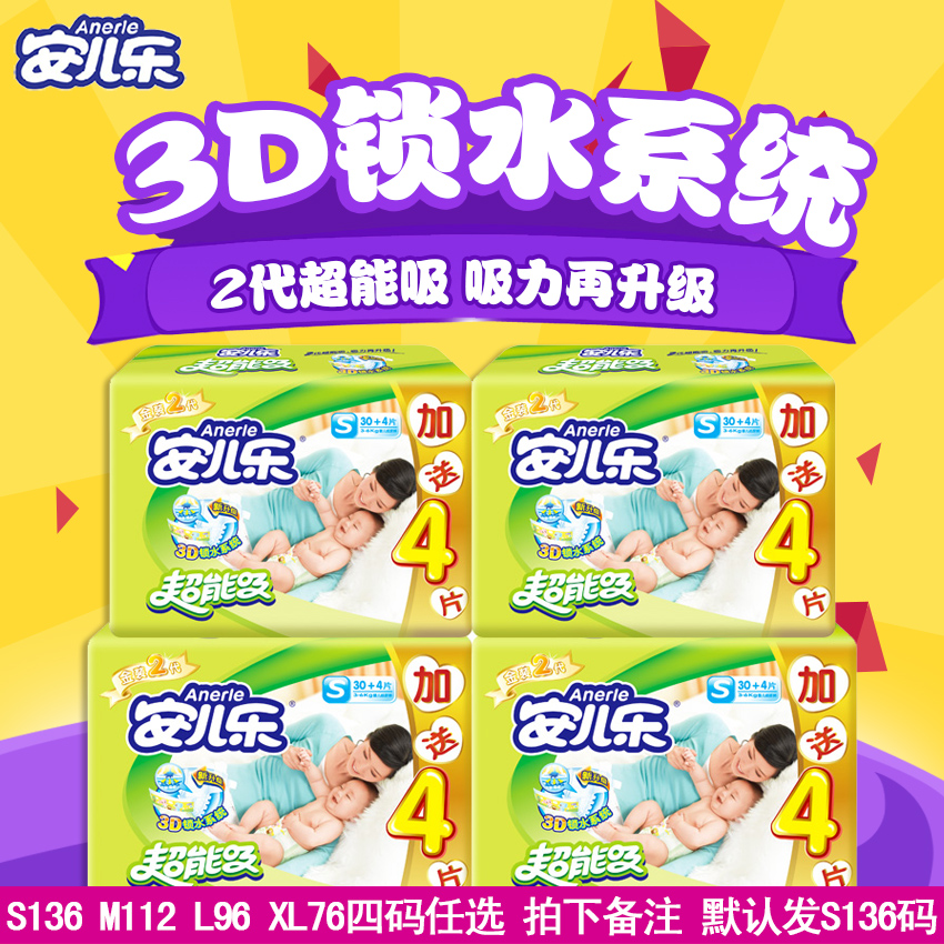 安儿乐超能吸婴儿纸尿裤(S30+4片)*4包尿不湿3-6KG男女宝宝通用