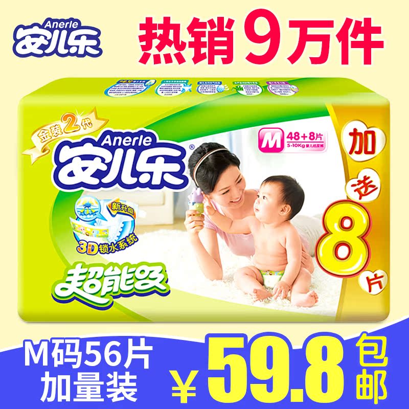安儿乐婴儿纸尿裤婴儿尿不湿M48+8片超能吸安尔乐纸尿裤M号薄透气