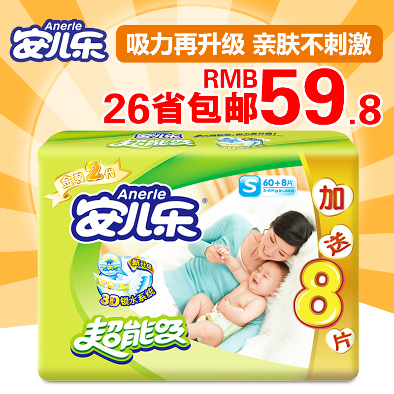 安儿乐超能吸纸尿裤S60+8片 安尔乐纸尿裤薄透气 新生婴儿尿不湿
