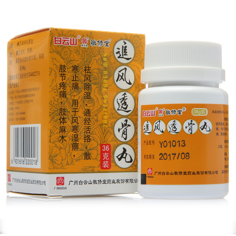 品牌:敬修堂 有效期:24个月 产品剂型:丸剂 用法:口服 药品类别:中药 适用人群:成人 药品分类:处方药 症状:肢体麻木 疾病:风湿关节病 批准文号:国药准字Z44022711 药品名称:追风透骨丸 药品通用名:追风透骨丸 使用剂量:口服,一次6g(装至瓶盖内环平面)一日2次。30天为一疗程。 生产企业:广州敬修堂股份有限公司 药品规格:36g/盒 查看全文