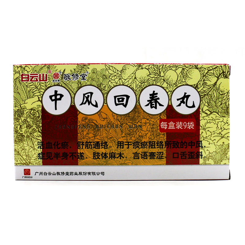 适用人群:不限 产品剂型:丸剂 用法:口服 药品类别:中药 药品分类:处方药 品牌:白云山 有效期:30个月 疾病:中风 症状:半身不遂 使用剂量:温开水送服。一次1.2~1.8g,一日3次,或遵医嘱。 批准文号:国药准字Z44020867 生产企业:广州敬修堂药业股份有限公司 药品名称:中风回春丸 药品规格:1.8g*9袋/盒 药品通用名:中风回春丸 查看全文