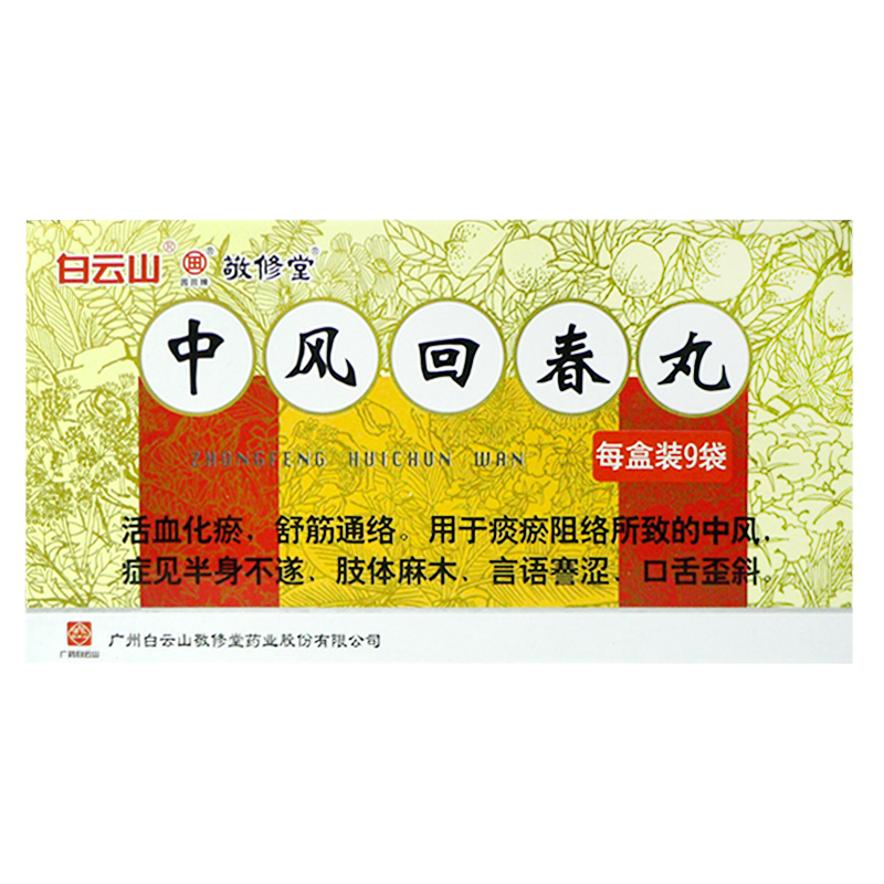 适用人群:不限 产品剂型:丸剂 用法:口服 药品类别:中药 药品分类:处方药 品牌:白云山 有效期:30个月 疾病:中风 症状:半身不遂 使用剂量:温开水送服。一次1.2~1.8g,一日3次,或遵医嘱。 批准文号:国药准字Z44020867 生产企业:广州敬修堂药业股份有限公司 药品名称:中风回春丸 药品规格:1.8g*9袋/盒 药品通用名:中风回春丸 查看全文