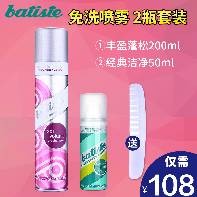 产地:英国 品牌:Batiste/碧缇丝 洗发护发单品:免水洗发喷雾(清爽飘逸) 适用发质:所有发质 规格类型:正常规格 化妆品净含量:【新品】丰盈蓬松200ml+经典洁净50ml 化妆品特性:使用效果 功效:清洁 发色亮泽 清透润泽光泽亮丽 丰盈蓬松 改善毛躁 控油 查看全文