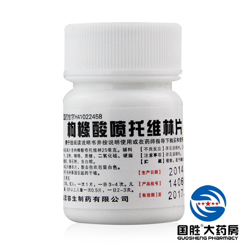 产品剂型:片剂 适用人群:不限 药品分类:非处方药 套餐类型:标准装 用法:口服 有效期:36个月 类别:化学药 疾病:咽喉炎 品牌:天武 症状:干咳 使用剂量:一次0.5-1片,一日2—4次 药品名称:枸橼酸喷托维林片 药品通用名:枸橼酸喷托维林片 批准文号:国药准字H41022458 生产企业:国药集团容生制药 规格:25mg*100片/瓶 查看全文