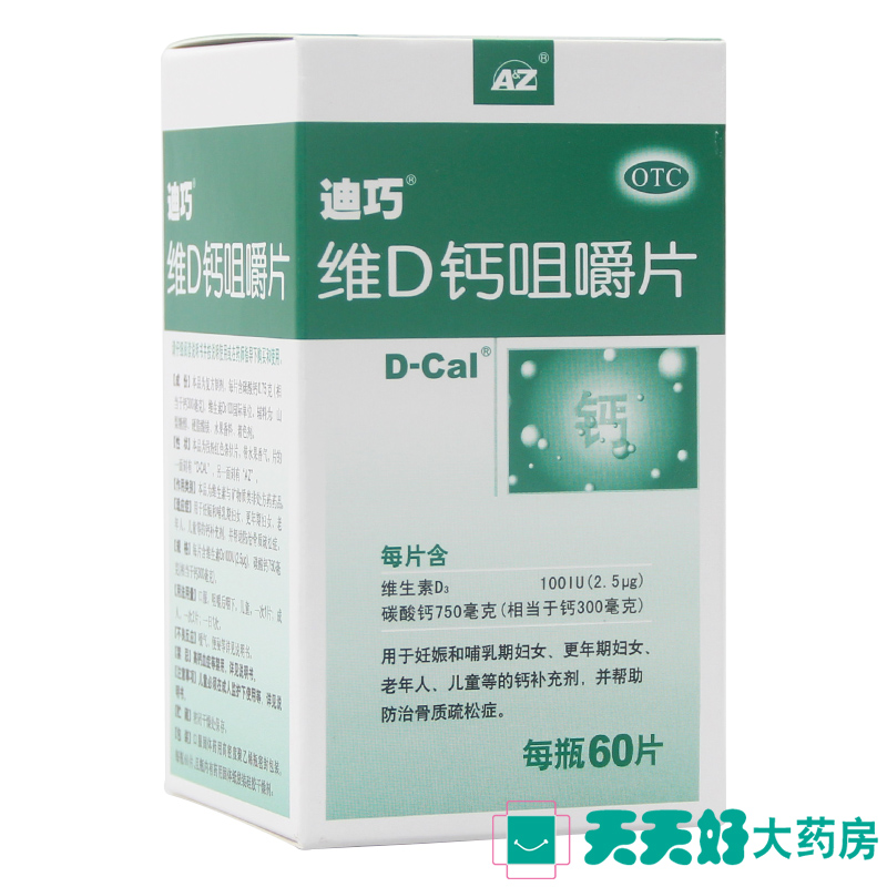 产品剂型:片剂 适用人群:不限 药品分类:非处方药 套餐类型:标准装 用法:口服 有效期:36个月 规格:60片*1瓶/盒 类别:复方制剂 使用剂量:儿童,一次1片;成人,一次2片,一日1次 品牌:D-Cal/迪巧 疾病:骨质疏松症.软骨病.生长发育不良.佝偻病.矿物质缺乏症 症状:骨质疏松.多动.发育迟缓.夜惊.手足抽搐.精力不集中 药品名称:迪巧 维D钙咀嚼片 药品商品名:迪巧 药品通用名:维D钙咀嚼片 批准文号:国药准字J20140154 生产企业:美国安士制药有限公司 查看全文