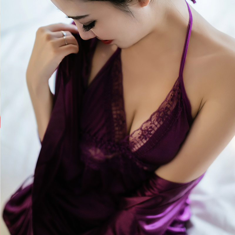 性感情趣内衣女性骚三点睡衣吊带连衣裙丁字裤蕾丝透明紫色套装TR