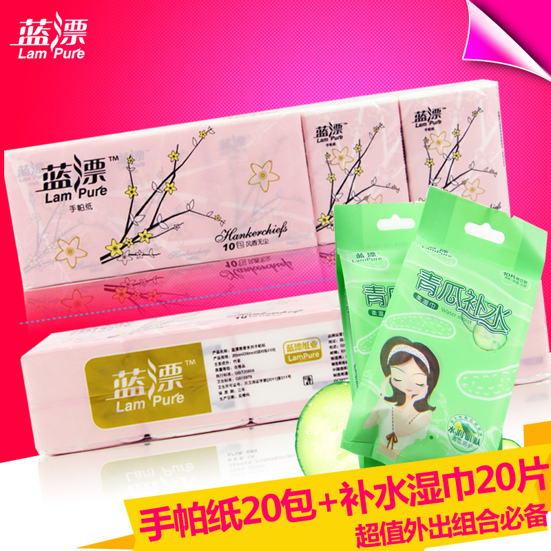 蓝漂便携出门必备手帕纸3层2条20包与青瓜补水湿纸巾2包20片 包邮