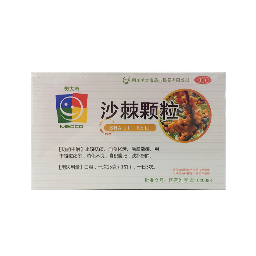 适用人群:不限 药品分类:非处方药 用法:口服 产品剂型:颗粒 类别:复方制剂 有效期:30个月 规格:15g*6袋/盒 症状:咳嗽 疾病:上呼吸道感染 品牌:美大康 生产企业:四川美大康药业股份有限公司 使用剂量:口服,一次15克(1袋),一日3次。 药品名称:沙棘颗粒 药品通用名:沙棘颗粒 批准文号:国药准字Z51020088 查看全文