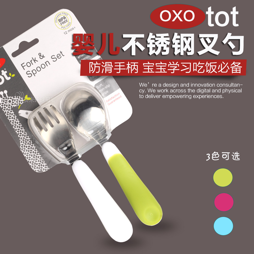 美国直邮OXO tot 婴幼儿不锈钢勺子叉子套装防滑手柄不含BPA