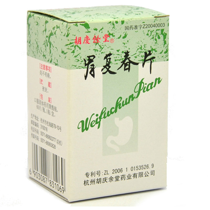 产品剂型:片剂 适用人群:不限 有效期:24个月 用法:口服 药品类别:中药 药品分类:处方药 使用剂量:一次4片,一日3次 品牌:胡庆余堂 生产企业:杭州胡庆余堂药业有限公司 疾病:胃癌 批准文号:国药准字Z20040003 药品名称:胃复春片 药品通用名:胃复春片 药品规格:0.36g*60片*1瓶/盒 症状:上腹不适.乏力.便血.呕吐.恶心.食欲下降 查看全文