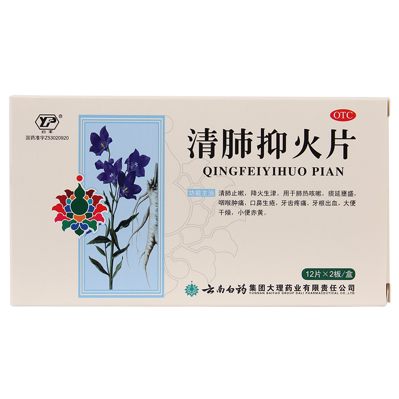 产品剂型:片剂 药品分类:非处方药 用法:口服 适用人群:成人 有效期:36个月 类别:中药 规格:0.6g*24片/盒 品牌:云丰 药品名称:清肺抑火片 药品通用名:清肺抑火片 生产企业:云南白药集团大理药业有限责任公司 使用剂量:口服,一次4片,一日2次 疾病:气管炎.咽喉炎.扁桃体炎 症状:咽痛.咳嗽.咳痰 批准文号:国药准字Z53020920 查看全文