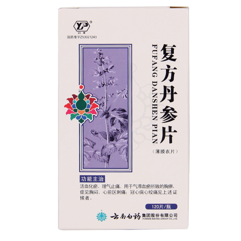 产品剂型:片剂 适用人群:不限 用法:口服 药品类别:中药 有效期:36个月 药品分类:处方药 生产企业:云南白药集团股份有限公司 品牌:云丰 使用剂量:一次3片,一日3次。 疾病:冠心病 症状:心绞痛 药品名称:复方丹参片 药品通用名:复方丹参片 批准文号:国药准字Z53021243 药品规格:0.32g*120片/瓶 查看全文