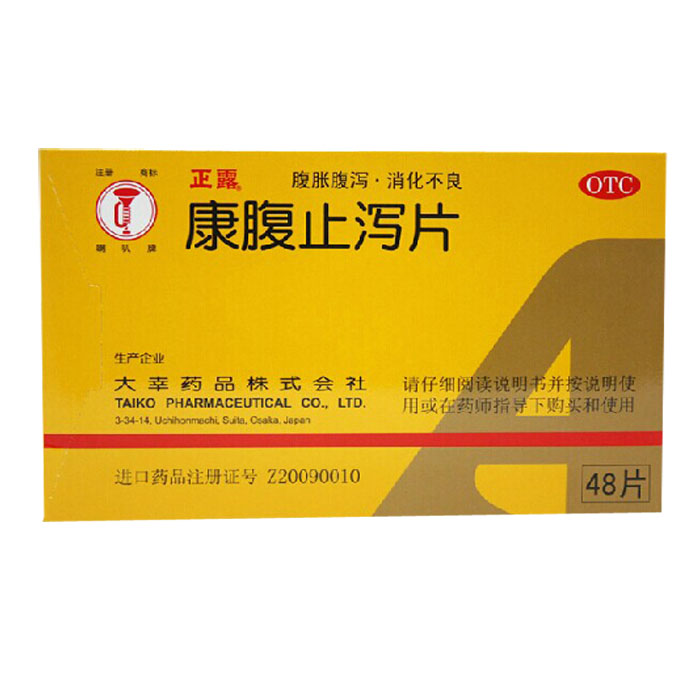 产品剂型:片剂 适用人群:不限 药品分类:非处方药 套餐类型:标准装 有效期:60个月 用法:口服 类别:中药 疾病:消化不良 品牌:喇叭 药品名称:康腹止泻片 药品通用名:康腹止泻片 生产企业:大幸药品株式会社(日本) 规格:48片/盒 使用剂量:成人每次4片,每日3次,饭后服之 症状:大便稀而多.呕吐.腹泻.腹胀.恶心.消化不良 批准文号:进口药品注册证号Z20090010 查看全文