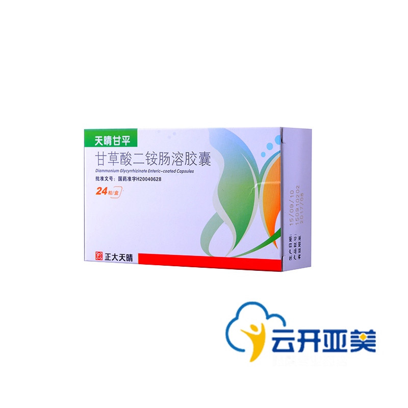 产品剂型:胶囊 有效期:24个月 药品类别:化学药 用法:口服 适用人群:成人 药品分类:处方药 疾病:慢性乙肝 症状:肝区胀痛 使用剂量:一次150mg.一日3次 品牌:正大天晴 批准文号:国药准字H20040628 生产企业:正大天晴药业集团股份有限公司 药品名称:天晴甘平 甘草酸二铵肠溶胶囊 药品商品名:天晴甘平 药品规格:50mg*24粒/盒 药品通用名:甘草酸二铵肠溶胶囊 查看全文