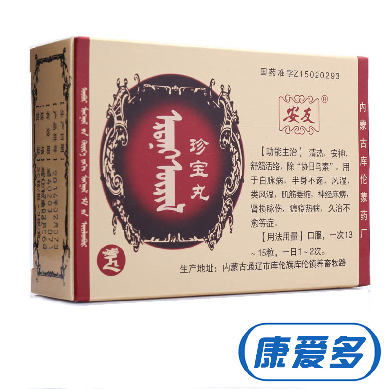 适用人群:不限 产品剂型:丸剂 用法:口服 药品类别:中药 有效期:36个月 药品分类:处方药 疾病:中风 症状:半身不遂 品牌:安友 生产企业:内蒙古库伦蒙药厂 药品名称:珍宝丸 药品通用名:珍宝丸 使用剂量:一次13~15丸,一日2次 批准文号:国药准字Z15020293 药品规格:0.2g*90粒/盒 查看全文