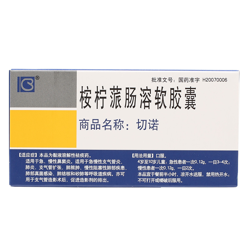 产品剂型:胶囊 药品类别:化学药 用法:口服 适用人群:成人 有效期:36个月 药品分类:处方药 疾病:支气管炎 使用剂量:详见说明书 品牌:切诺 批准文号:国药准字H20052401 生产企业:北京九和药业有限公司 药品名称:切诺 桉柠蒎肠溶软胶囊 药品商品名:切诺 药品通用名:桉柠蒎肠溶软胶囊 症状:咽痛 药品规格:0.3g*6粒/盒 查看全文