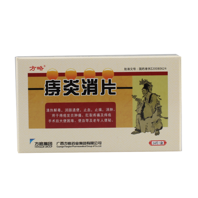 产品剂型:片剂 有效期:24个月 用法:口服 药品类别:中药 适用人群:成人 药品分类:处方药 疾病:痔疮 药品名称:痔炎消片 药品通用名:痔炎消片 症状:便血 品牌:方略 生产企业:广西方略药业集团有限公司 使用剂量:一次2~4片、一日3次 批准文号:国药准字Z20080624 药品规格:0.29g*24片/盒 查看全文