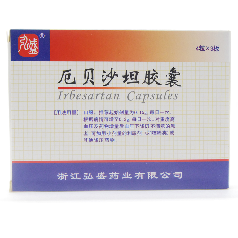 产品剂型:胶囊 适用人群:不限 有效期:24个月 药品类别:化学药 用法:口服 药品分类:处方药 疾病:高血压 症状:血压高 药品通用名:厄贝沙坦胶囊 使用剂量:每次0.15,每日1次 品牌:弘盛 批准文号:国药准字H20052155 生产企业:浙江弘盛药业有限公司 药品名称:厄贝沙坦胶囊 药品规格:75mg*12粒/盒 查看全文