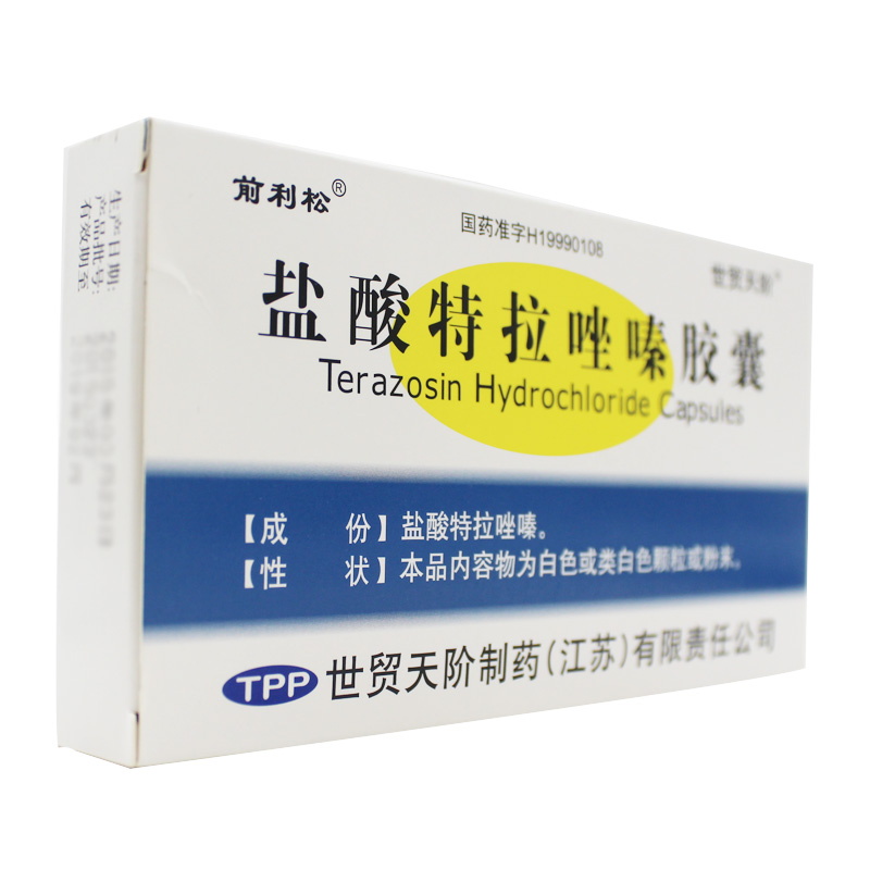 产品剂型:胶囊 药品类别:化学药 用法:口服 适用人群:成人 药品分类:处方药 有效期:48个月 疾病:前列腺增生 症状:前列腺肿大 品牌:世贸天阶 生产企业:世贸天阶制药(江苏)有限责任公司 药品规格:2mg*12粒/盒 药品通用名:盐酸特拉唑嗪胶囊 药品名称:盐酸特拉唑嗪胶囊 使用剂量:首次剂量1mg(1/2粒) 批准文号:国药准字H19990108 查看全文