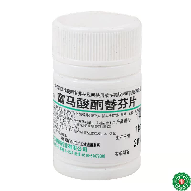 产品剂型:片剂 药品分类:非处方药 用法:口服 疾病:鼻炎 类别:化学药 有效期:48个月 症状:流涕.鼻痒.鼻塞 套餐类型:套餐一.标准装 适用人群:妇科.男科 品牌:鹏鹞 生产企业:江苏鹏鹞药业有限公司 使用剂量:口服,一次1片,一日2次,早晚服 药品名称:富马酸酮替芬片 药品通用名:富马酸酮替芬片 批准文号:国药准字H32023636 规格:60片/瓶 查看全文