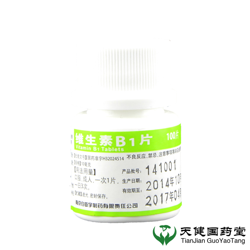 产品剂型:片剂 药品分类:非处方药 套餐类型:标准装 用法:口服 适用人群:成人 类别:化学药 症状:发育迟缓 有效期:30个月 疾病:维生素缺乏症 药品名称:维生素B1片 药品通用名:维生素B1片 规格:10mg*100片/瓶 生产企业:南京白敬宇制药有限责任公司 品牌:白敬宇 使用剂量:一次1-2片,一日3次。 批准文号:国药准字H32024514 查看全文