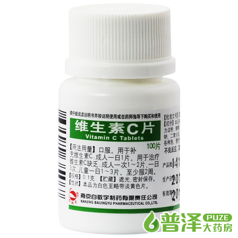 产品剂型:片剂 药品分类:非处方药 用法:口服 类别:化学药 症状:发育迟缓 适用人群:儿童.成人 疾病:维生素缺乏症 有效期:18个月 药品名称:维生素C片 药品通用名:维生素C片 规格:0.1g*100片/瓶 生产企业:南京白敬宇制药有限责任公司 品牌:白敬宇 使用剂量:成人一次1-2片,儿童一日1-3片。 批准文号:国药准字H32025834 查看全文
