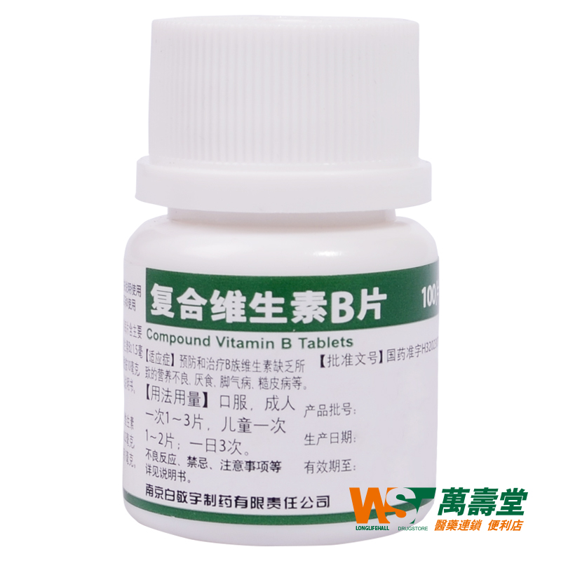 产品剂型:片剂 药品分类:非处方药 套餐类型:标准装 用法:口服 适用人群:成人 类别:化学药 症状:发育迟缓 有效期:30个月 疾病:维生素缺乏症 规格:100片/瓶 生产企业:南京白敬宇制药有限责任公司 品牌:白敬宇 使用剂量:成人一次1-3片,儿童一次1-2片;一日3次。 药品名称:复合维生素B片 药品通用名:复合维生素B片 批准文号:国药准字H32023078 查看全文