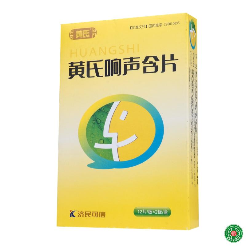 产品剂型:片剂 适用人群:不限 有效期:24个月 药品类别:中药 药品分类:处方药 用法:含服 药品规格:0.6g*24片/盒 使用剂量:含服,具体详见说明书 品牌:黄氏 批准文号:国药准字Z20010035 生产企业:无锡济民可信山禾药业股份有限公司 药品名称:黄氏响声含片 药品通用名:黄氏响声含片 疾病:口疮.口腔溃疡.咽喉炎.咽炎.扁桃体炎 症状:健齿固龈.养阴润肺.口干.口干咽燥.口苦.咳嗽不爽.咳痰.咽下不利.咽干.咽痒.喘息气促.干咳.扁桃体肿大.清利咽喉 查看全文