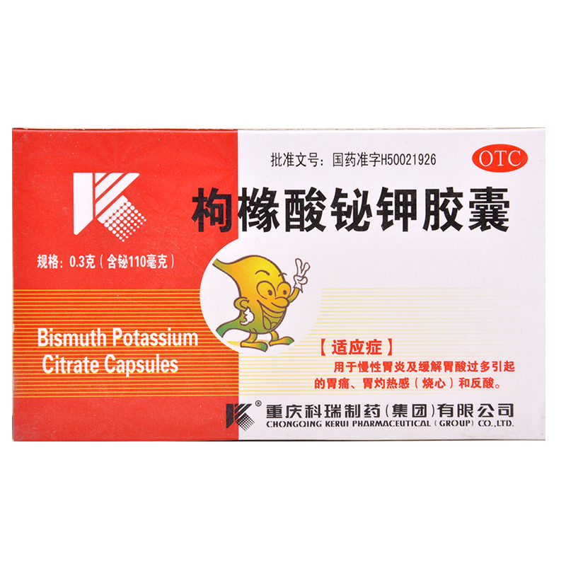 产品剂型:胶囊 有效期:24个月 药品分类:非处方药 用法:口服 适用人群:成人 类别:化学药 症状:反酸.胃痛 规格:0.3g*20粒/盒 疾病:胃酸过多 品牌:科瑞 药品通用名:枸橼酸铋钾胶囊 药品名称:枸橼酸铋钾胶囊 生产企业:重庆科瑞制药(集团)有限公司 使用剂量:成人一次1粒,一日4次 批准文号:国药准字H50021926 查看全文
