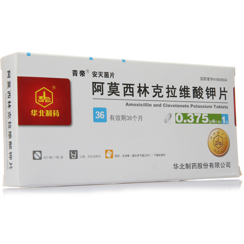产品剂型:片剂 适用人群:不限 用法:口服 有效期:36个月 药品类别:复方制剂 药品分类:处方药 生产企业:华北制药股份有限公司 品牌:华北制药 药品名称:阿莫西林克拉维酸钾片 药品通用名:阿莫西林克拉维酸钾片 药品规格:0.375g*6片/盒 使用剂量:口服。成人和12岁以上小儿.一次1片,一日2次 批准文号:国药准字H10920034 疾病:蜂窝组织炎.鼻窦炎.盆腔炎.前列腺炎.咽炎.膀胱炎.尿路感染.尿道炎.中耳炎.泌尿系统感染.扁桃体炎.肺炎.淋病.上呼吸道感染.疖.骨髓炎.急性支气管炎.败血症.腹膜炎.皮肤和软组织感染.肾盂肾炎.肺脓肿.伤口感染.下呼吸道感染.脓毒症.慢性支气管炎急性发作.术后感染.支气管合并感染.软性下疽.腹内脓毒症 症状:蜂窝组织炎.发热.上呼吸道感染.败血症.腹膜炎.皮肤和软组织感染.伤口感染.下呼吸道感染.脓肿 查看全文