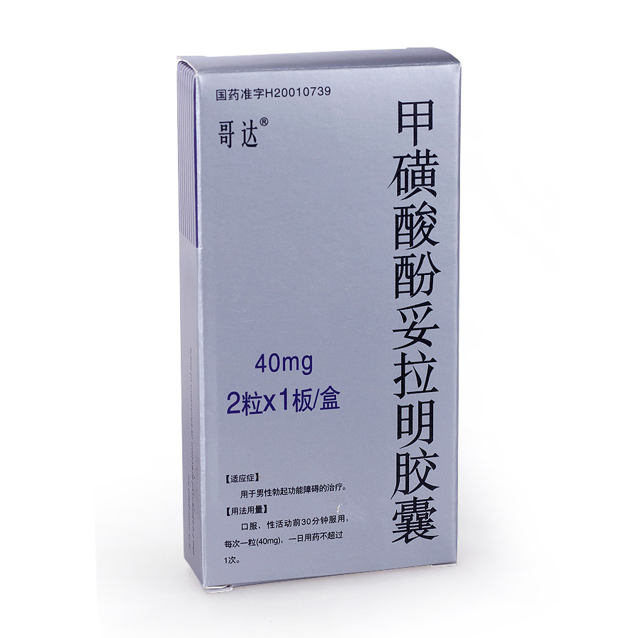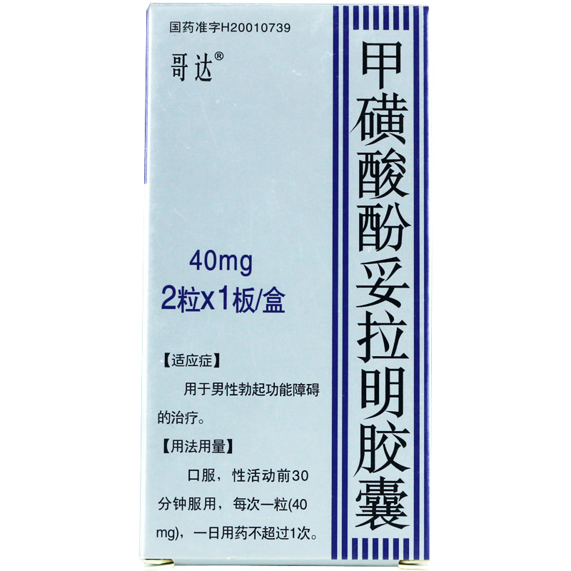 产品剂型:胶囊 有效期:24个月 药品类别:化学药 用法:口服 药品分类:处方药 适用人群:男科 症状:肾阳不足 疾病:阳痿 使用剂量:在性生活前30分钟服用,每次一粒(40mg),一日用药不超过1次 品牌:哥达 批准文号:国药准字H20010739 生产企业:苏州二叶制药有限公司 药品名称:启伟 甲磺酸酚妥拉明胶囊 药品商品名:启伟 药品规格:40mg*2粒/盒 药品通用名:甲磺酸酚妥拉明胶囊 查看全文