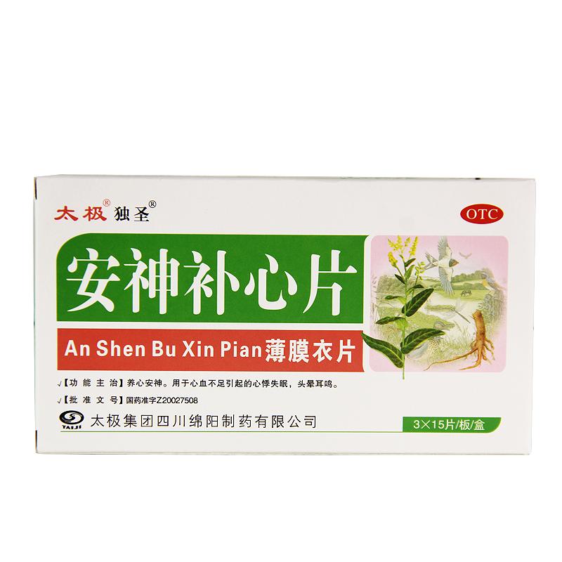 产品剂型:片剂 适用人群:不限 有效期:24个月 药品分类:非处方药 套餐类型:标准装 用法:口服 类别:中药 生产企业:太极集团四川绵阳制药有限公司 疾病:失眠症.心神失养 使用剂量:一次5片,一日3次。 品牌:独圣 药品名称:安神补心片 药品通用名:安神补心片 批准文号:国药准字Z20027508 症状:头昏.惊悸.耳鸣 规格:0.32g*45片/盒 查看全文