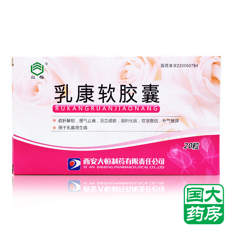 产品剂型:胶囊 用法:口服 药品类别:中药 药品分类:处方药 适用人群:妇科 有效期:暂定24个月 疾病:乳腺增生 症状:乳房肿痛 药品规格:0.5g*20粒/盒 使用剂量:一次2~3粒,一日2次。 品牌:众悦 批准文号:国药准字Z20050794 生产企业:西安大恒制药有限责任公司 药品名称:乳康软胶囊 药品通用名:乳康软胶囊 查看全文