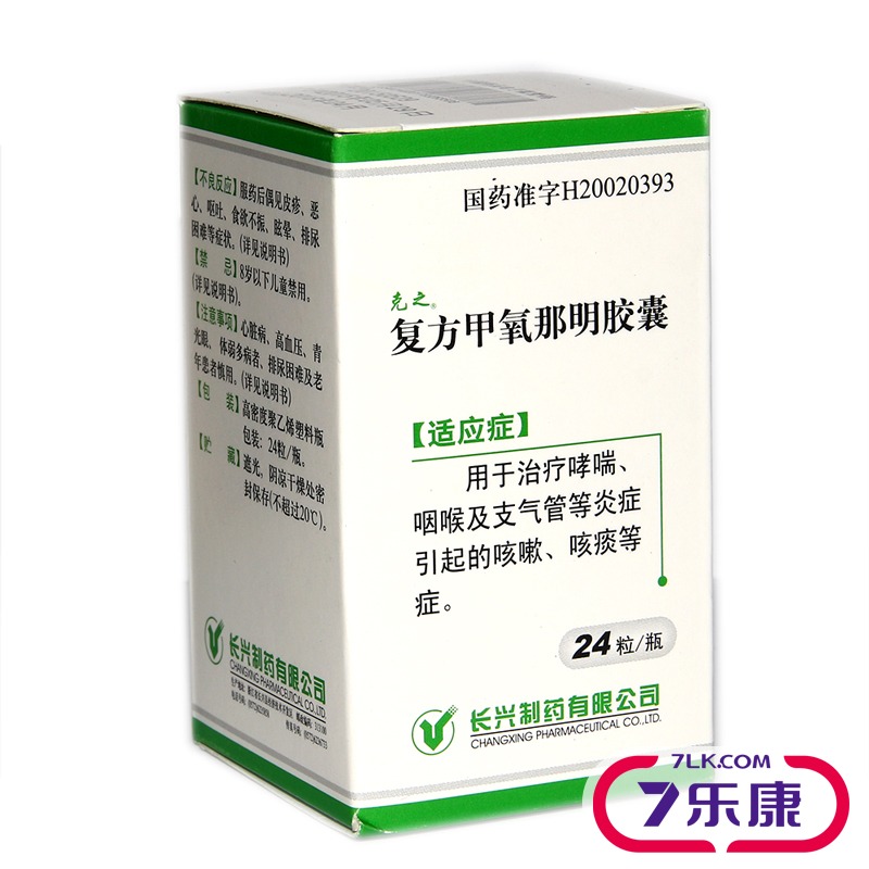 产品剂型:胶囊 适用人群:不限 用法:口服 有效期:36个月 药品类别:复方制剂 药品分类:处方药 疾病:支气管炎 使用剂量:成人一次2粒,一日3次。 症状:气促 生产企业:长兴制药有限公司 药品通用名:复方甲氧那明胶囊 品牌:克之 批准文号:国药准字H20020393 药品名称:克之胶囊 复方甲氧那明胶囊 药品商品名:克之胶囊 药品规格:24粒*1瓶/盒 查看全文