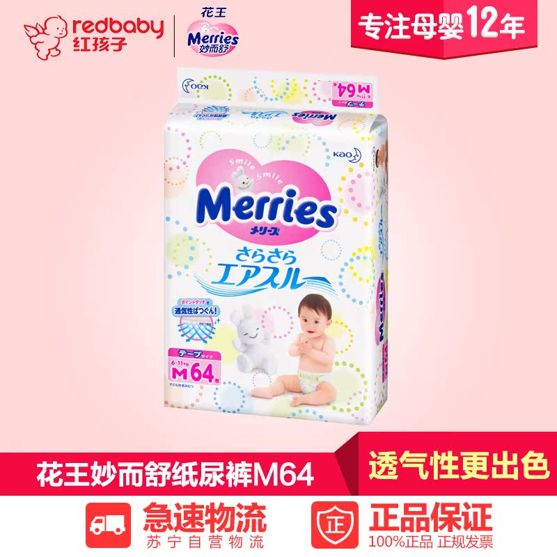 【红孩子母婴】花王(Merries)妙而舒纸尿裤中号M64片尿不湿