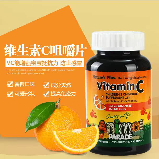 美国 Nature’s plus 动物大游行儿童天然VC维生素c片咀嚼片90片