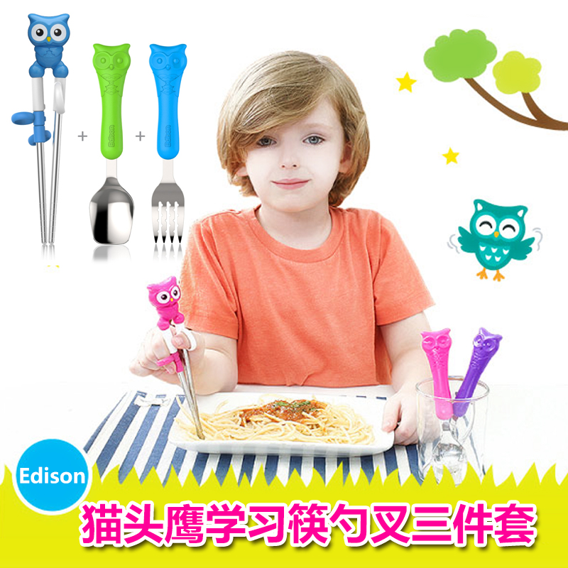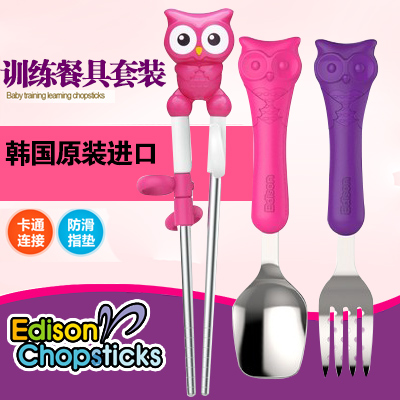 韩国爱迪生不锈钢餐具套装 卡通猫头鹰带柄学习筷勺子叉子训练筷