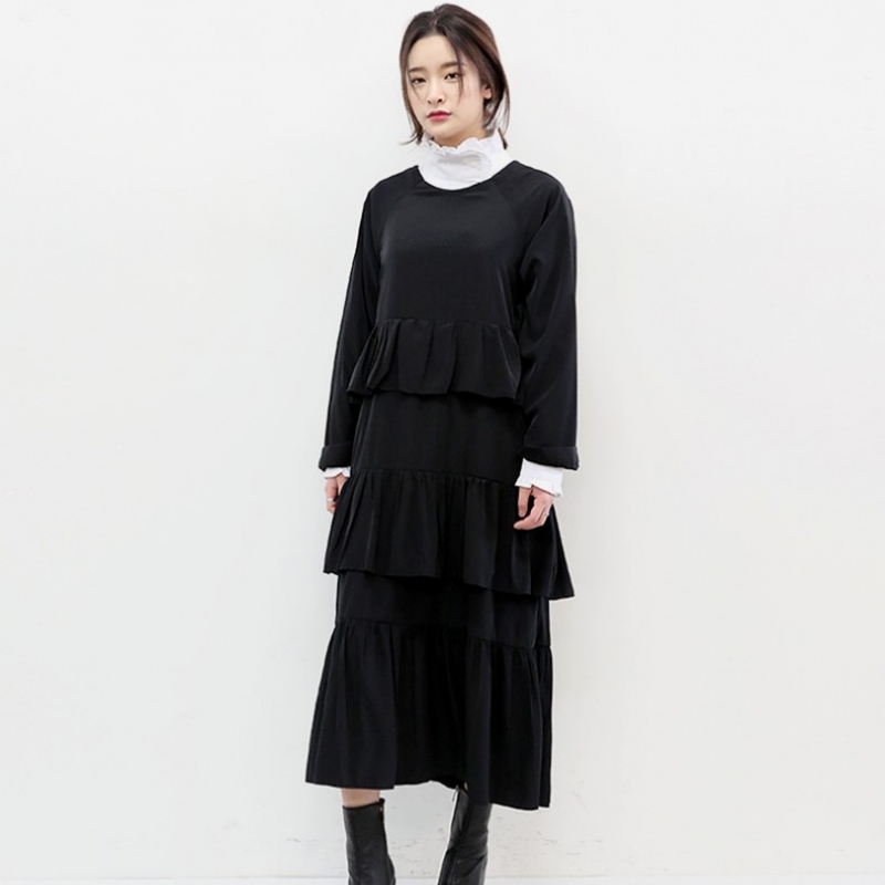 韩国stylenanda官方正品 优雅款层次感褶皱摆插肩袖连衣裙-黑色