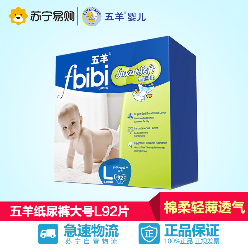 【苏宁易购】五羊婴儿纸尿裤L码92片 智能棉柔宝宝尿不湿