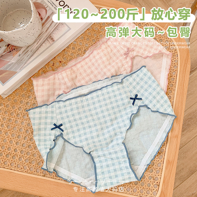 小甜橘大码内裤女胖mm200斤夏季薄款日系少女甜美格子木耳边中腰