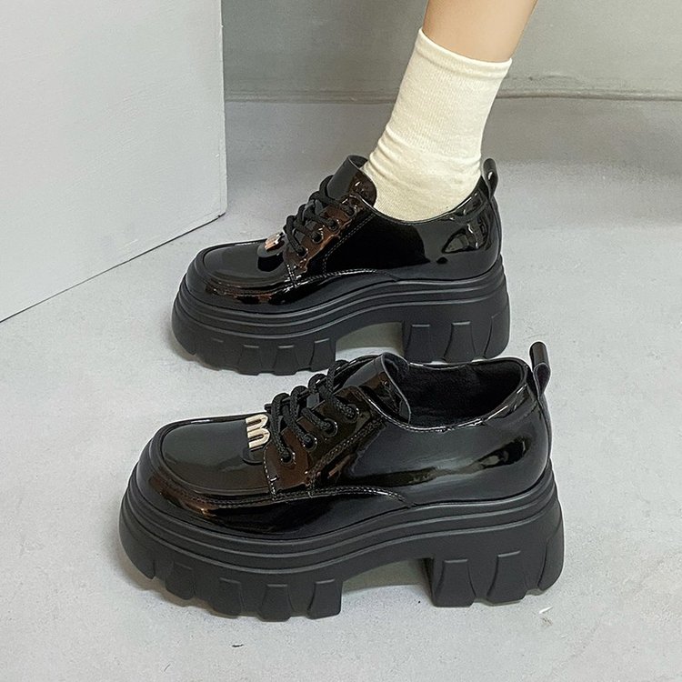 2023春季刘雯同款真皮厚底乐福鞋女增高松糕鞋漆皮英伦小皮鞋系带