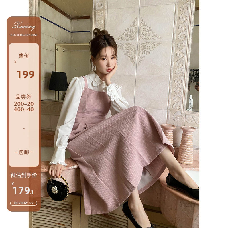 XXNING 法式小香风后背绑带吊带裙女2024新款高腰显瘦气质连衣裙
