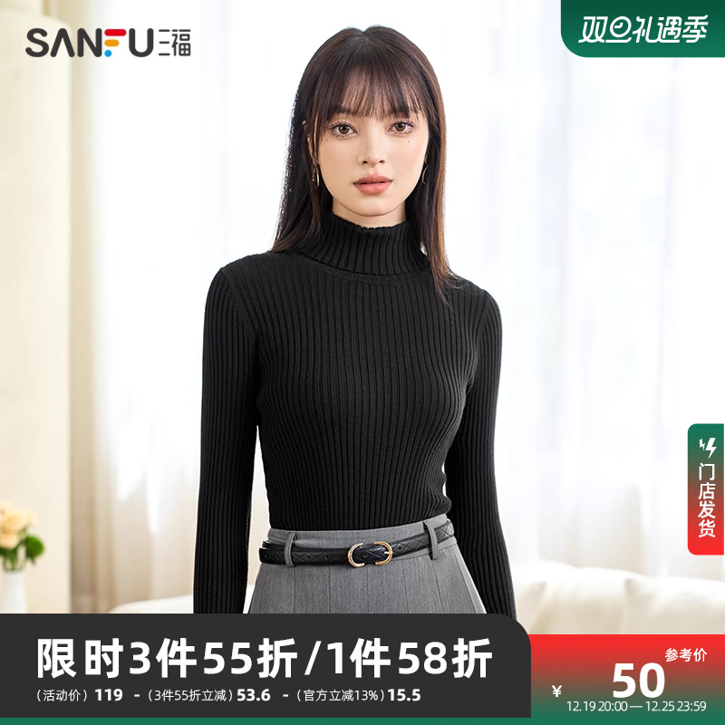 三福打底衫毛衣2023秋冬季高领保暖加厚修身内搭黑色针织上衣女装